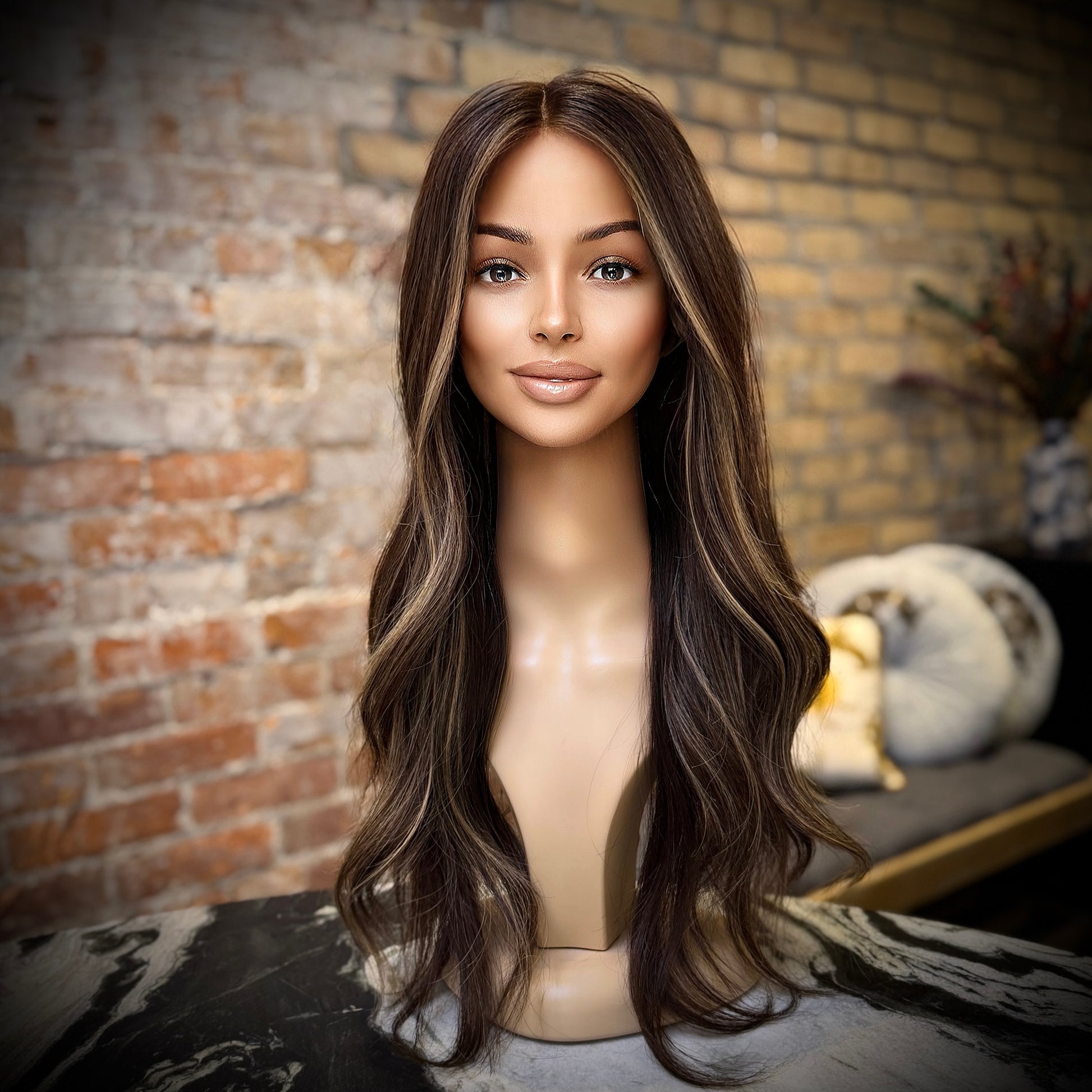 This medium cap brown wig features a rich brown base beautifully complemented by light blonde highlights, creating a stunning and natural look. Crafted from 100% European remy hair, it offers exceptional quality and durability, ensuring a luxurious feel and realistic appearance. The HD wig design enhances the overall aesthetic, making it an ideal choice for those seeking elegance and versatility in their hairstyle.